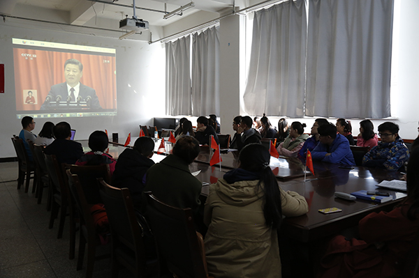 党的十九大是我们党在全面建成小康社会决胜阶段、中国特色社会主义关键时期召开的一次非常重要的大会,是全党全军全国各族人民政治生活中的大事。在观看直播现场,广大师生都聚精会神,认真听取习近平总书记做工作报告,边看边做记录、划重点,不时以热烈的掌声回应大会精彩报告。