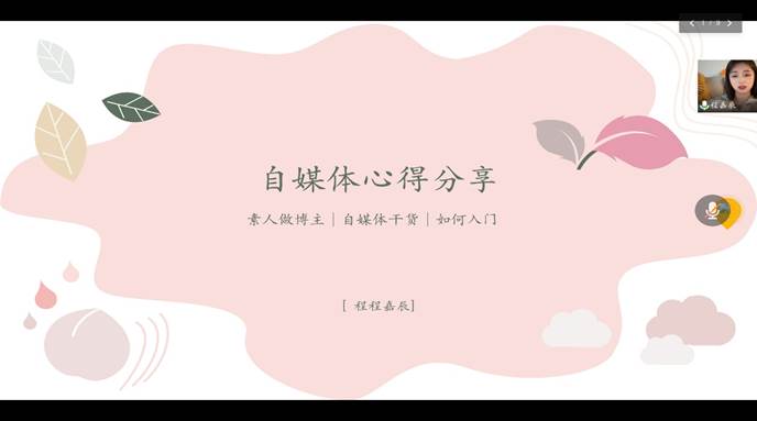 (通讯员 石玥昀佳)2022年4月9日晚6时,bat365正版唯一官网网络与新媒体系举办了《自媒体运用——从0到百万博主心路历程》经验分享会。会议邀请自媒体博主程嘉辰通过腾讯会议向全院师生展开新媒体相关的讲座交流活动。