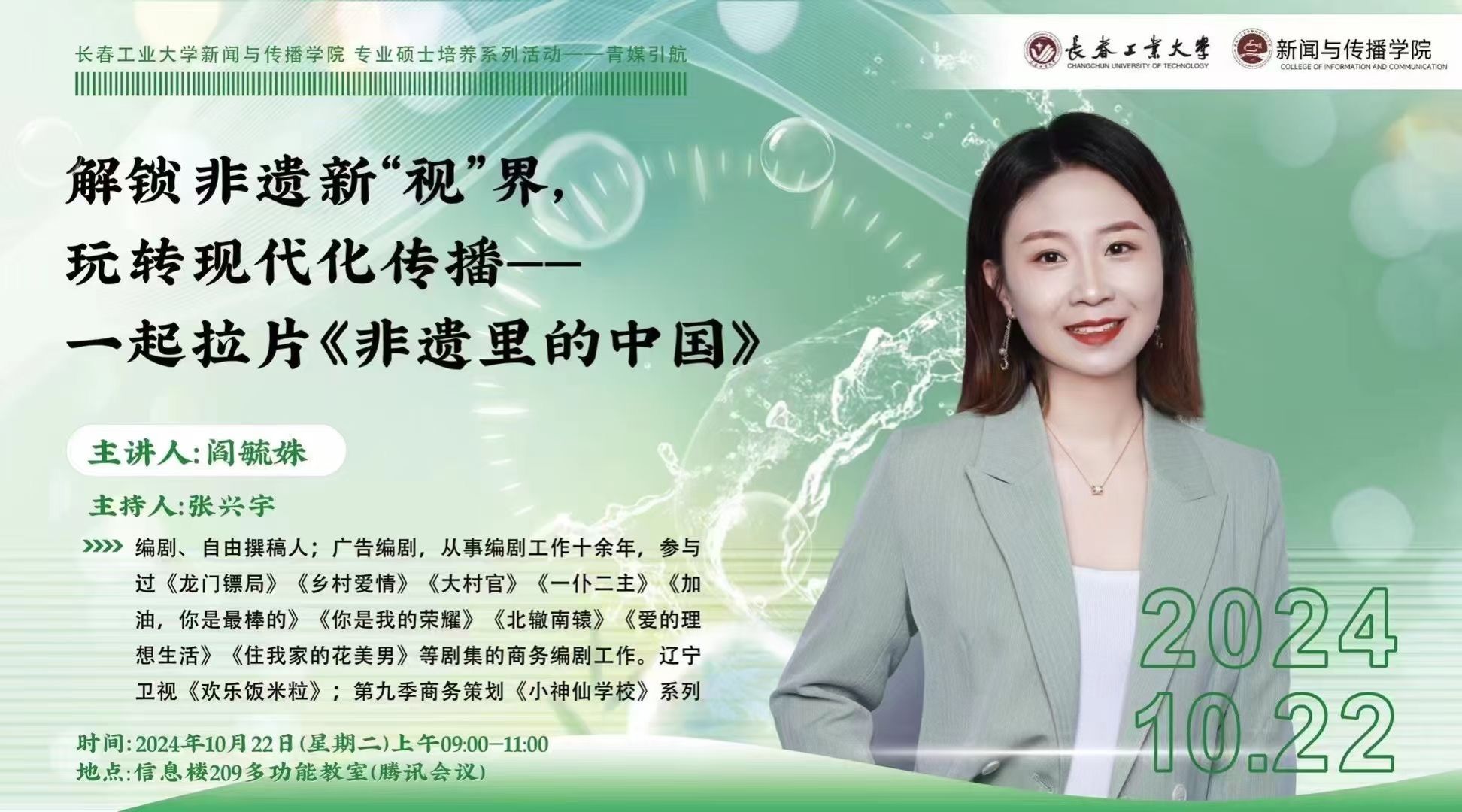 新闻网讯(通讯员 张兴宇 秦如月)为深入学习贯彻习近平文化思想,全面落实新时代新征程文化强国的战略部署,深入挖掘非遗文化的深厚内涵,探索其在现代化社会的创新传播路径,进一步推动bat365官网建设与人才培养。2024年10月22日上午9时,bat365正版唯一官网邀请到编剧、自由撰稿人阎毓姝,开展了题为《解锁非遗新“视”界 玩转现代化传播》专题讲座。该讲座由bat365官网广播电视编导专业教师张兴宇主持,bat365官网2024级广播电视、新闻与传播专业全体硕士研究生参与了此次讲座。