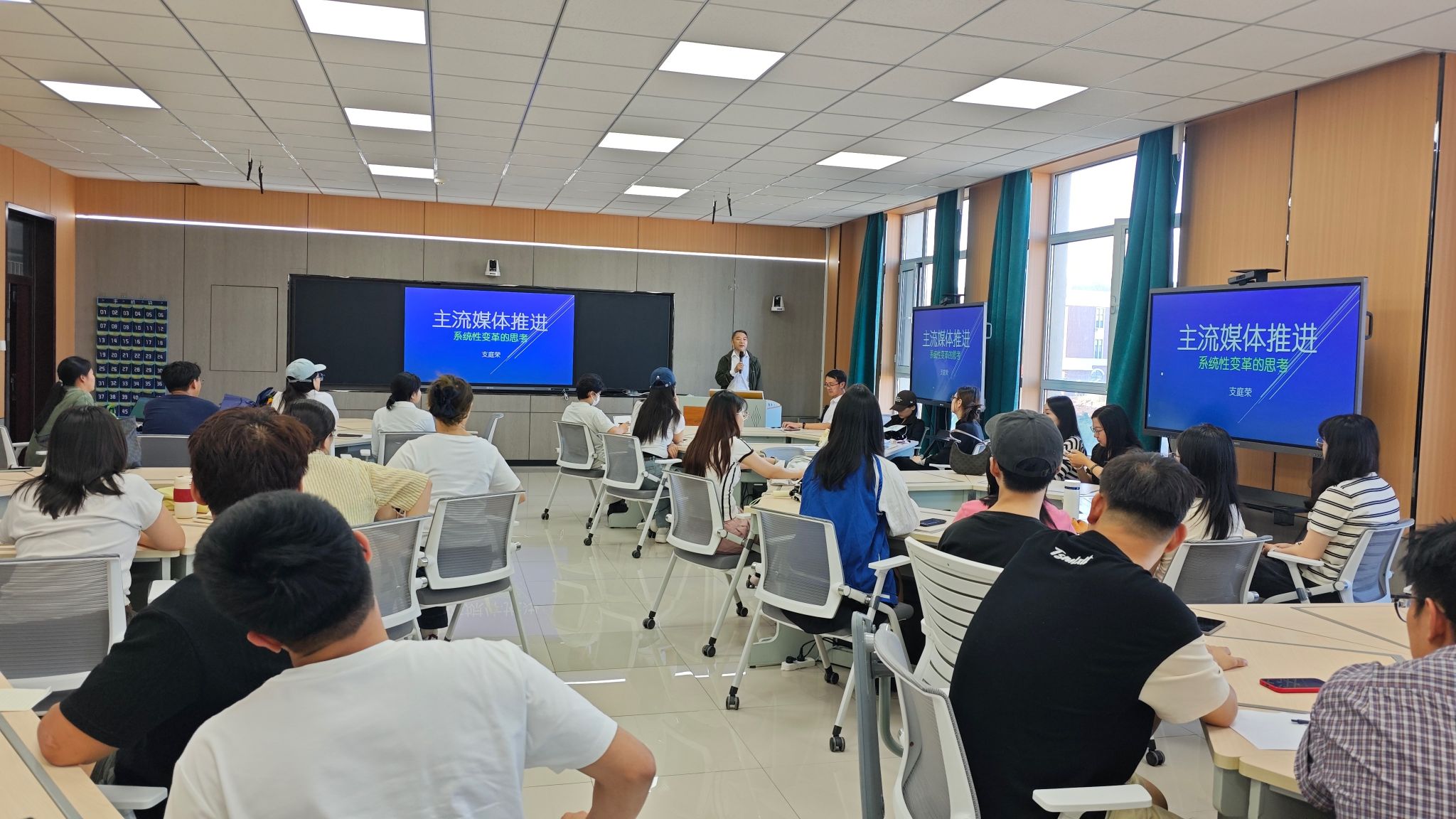 讲座尾声,支教授与在场师生进行了热烈互动,就大家关心的媒体人才能力结构、地方媒体转型路径等问题进行了深入解答。他鼓励同学们跳出传统新闻生产的框架,从“机构融合”和“系统融合”的更高维度,思考未来媒体生态的无限可能。