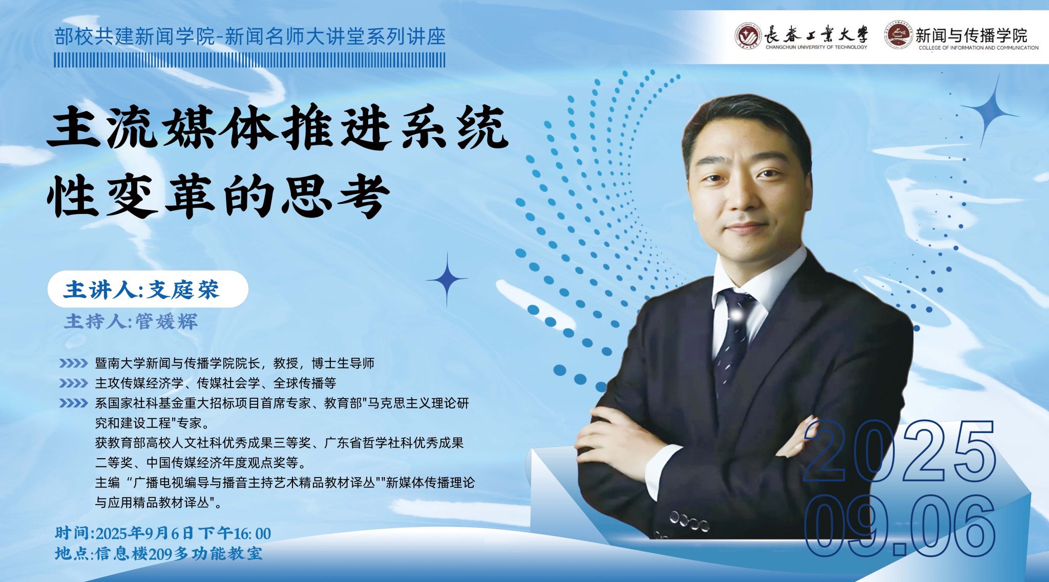 新闻网讯(通讯员 张兴宇)为进一步提高bat365官网研究生培养质量,推动卓越新闻人才体系建设,学院借助部校共建新闻学院平台优势,于2025年9月6日下午14时特邀暨南大学bat365正版唯一官网院长支庭荣教授开展题为《主流媒体推进系统性变革的思考》的专题讲座,讲座聚焦主流媒体如何深入贯彻落实中央关于推动媒体融合向纵深发展的决策部署,系统分析了媒体系统性变革的战略方向与实践策略,强调要坚守意识形态主阵地,全面提升传播力、引导力、影响力、公信力,为培养新时代新闻传播人才提供了重要的政治引领和理论指导。本次讲座由管媛辉院长主持。