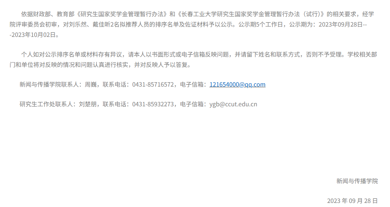 关于对2023年研究生国家奖学金拟推荐获奖名单进行公示的通知